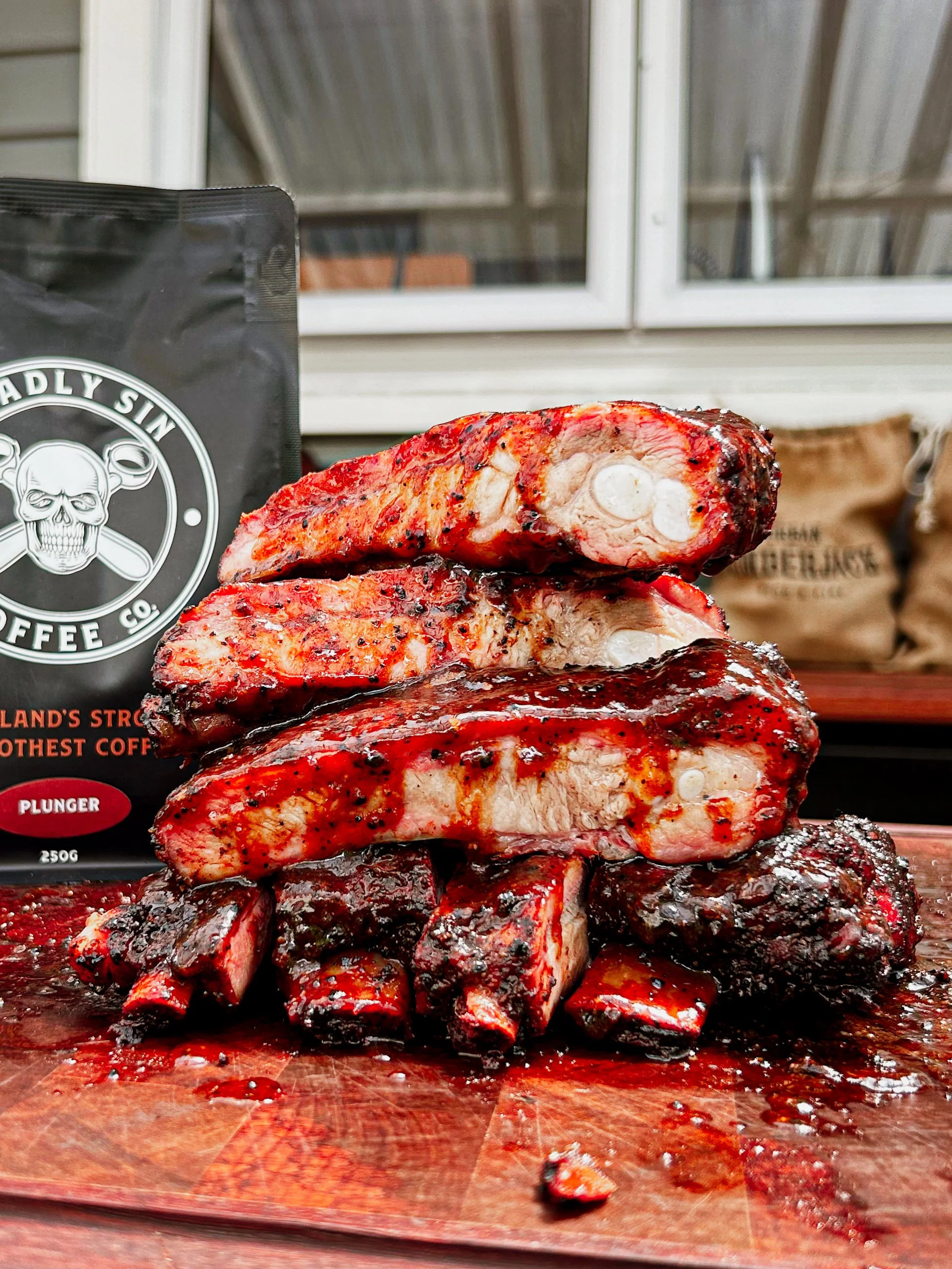 Once the Bark has set on the ribs, remove from the BBQ and place onto a double layer of foil, along with pats of butter, a sprinkle of brown sugar and a drizzle of coffee BBQ sauce.