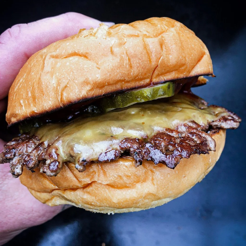 Using a large spatula or burger smasher, push down hard over the meat ball with a twist motion. The burgers should be as thin as a pencil. Season the patty's with salt and pepper.