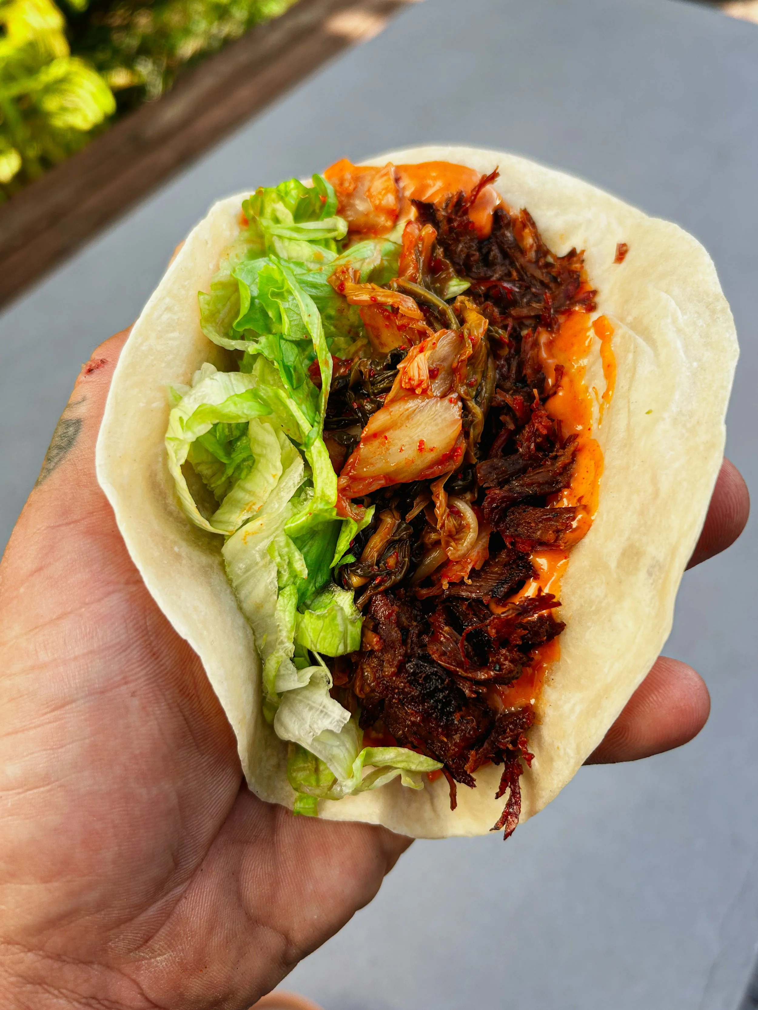 Add a dollop of spicy mayo to the tortilla and spread. Top with a generous amount of beef, then garish with kimchi and shredded lettuce.