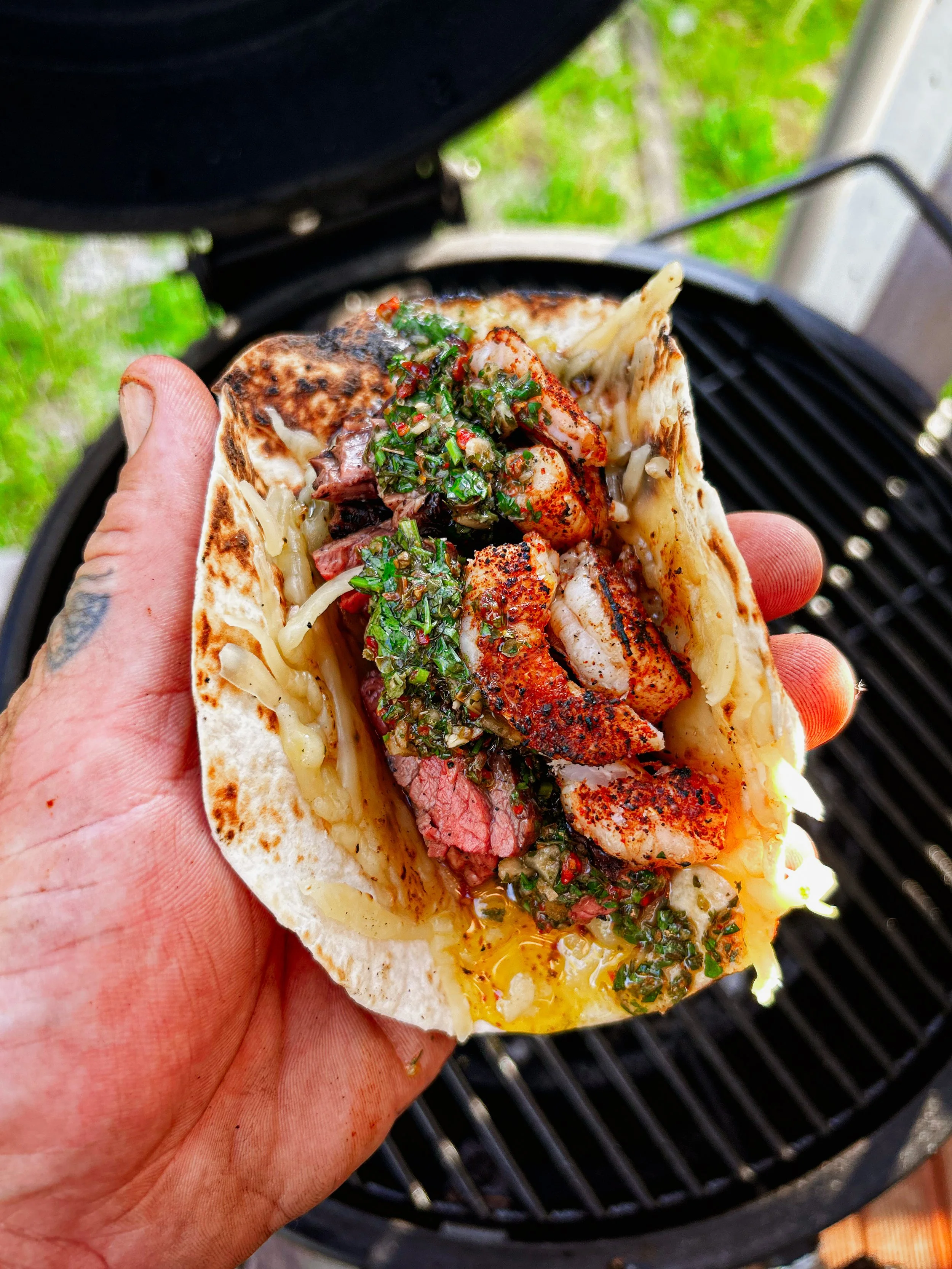 Grill the tortillas for a couple of seconds on each side, top with a little mozzarella then torch to melt. Slice the steak against the grain, then into bite sized pieces, topping the tortillas along side the prawns and chimichurri.