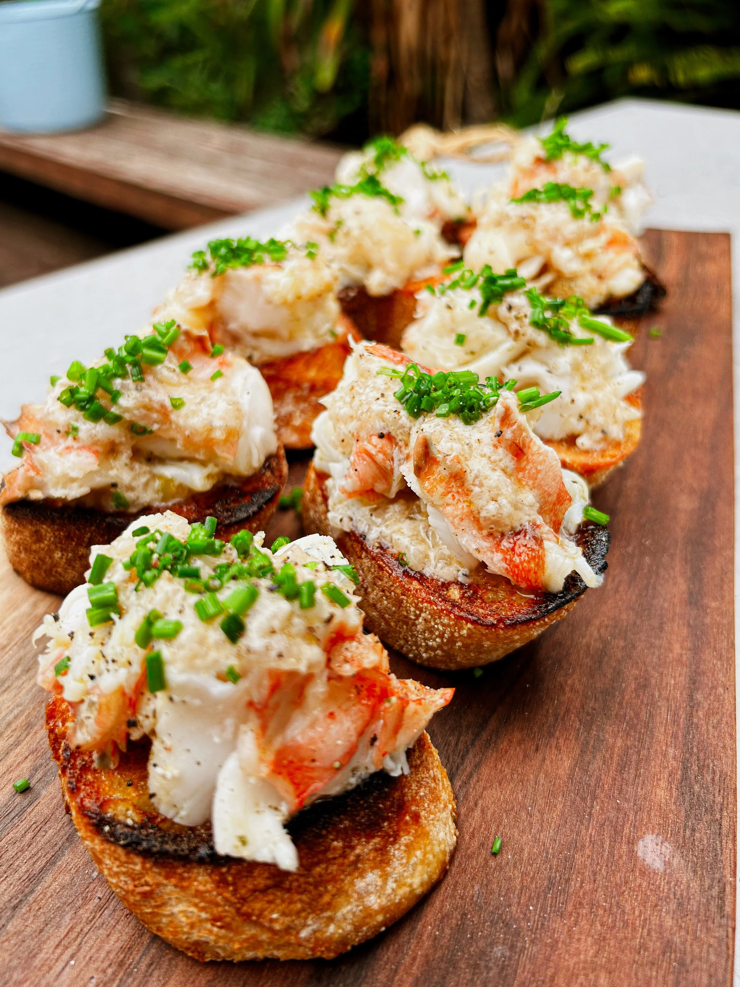 Top the toasted bread with a spoonful of Prosecco sauce. Follow this with the chunks of lobster, more sauce, then garnish with chives. Get in quick, these don’t last long.