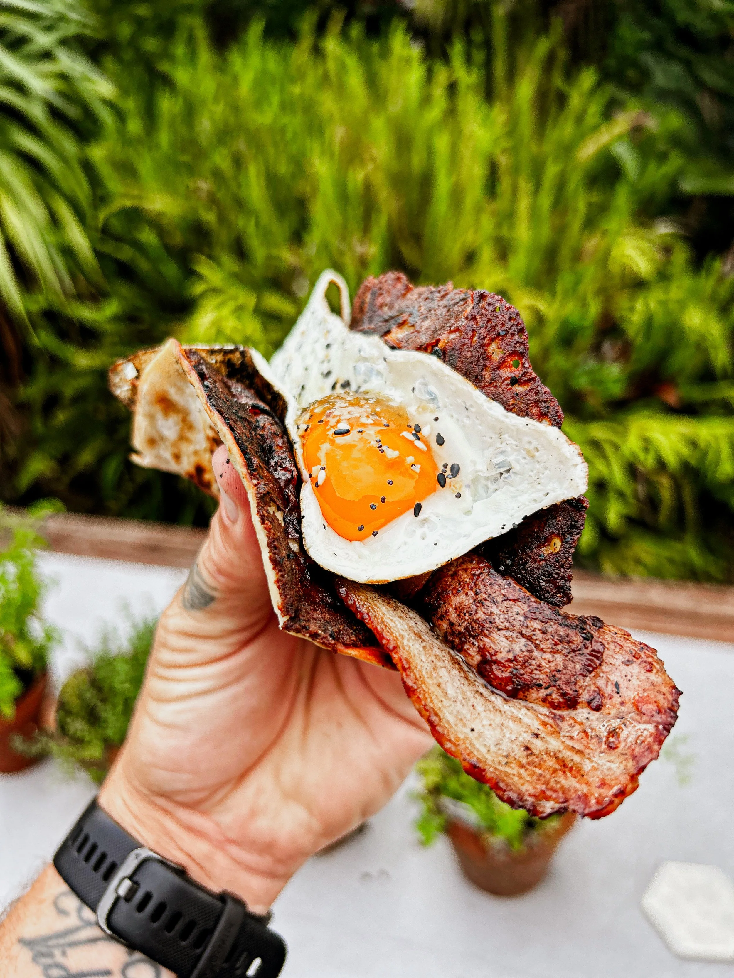 Place four piles of the mozzarella cheese onto the hot plate. When it begins to melt, add a spoonful of the crispy chilli oil and a ball of pork sausage meat to each pile. Pop a soft tortilla over the top then smash flat using the burger press. Cook for two minutes before flipping.
